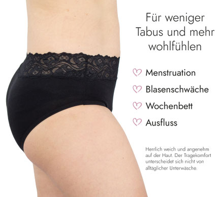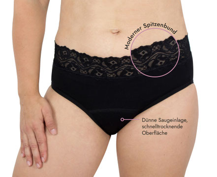 Egal ob beim Sport, auf langen Reisen oder im Alltag, der Slip schützt vor Auslaufen. Bei sehr starker Blutung kann es notwendig sein zusätzliche Hygieneprodukte wie Tampon oder Menstruationstasse zu verwenden. Der hohe und elastische Beinausschnitt gibt Dir maximale Bewegungsfreiheit. Der Spitzenbund verleiht dem Slip einen modernen Look. Nach dem Tragen einfach in der Waschmaschine waschen und erneut verwenden.